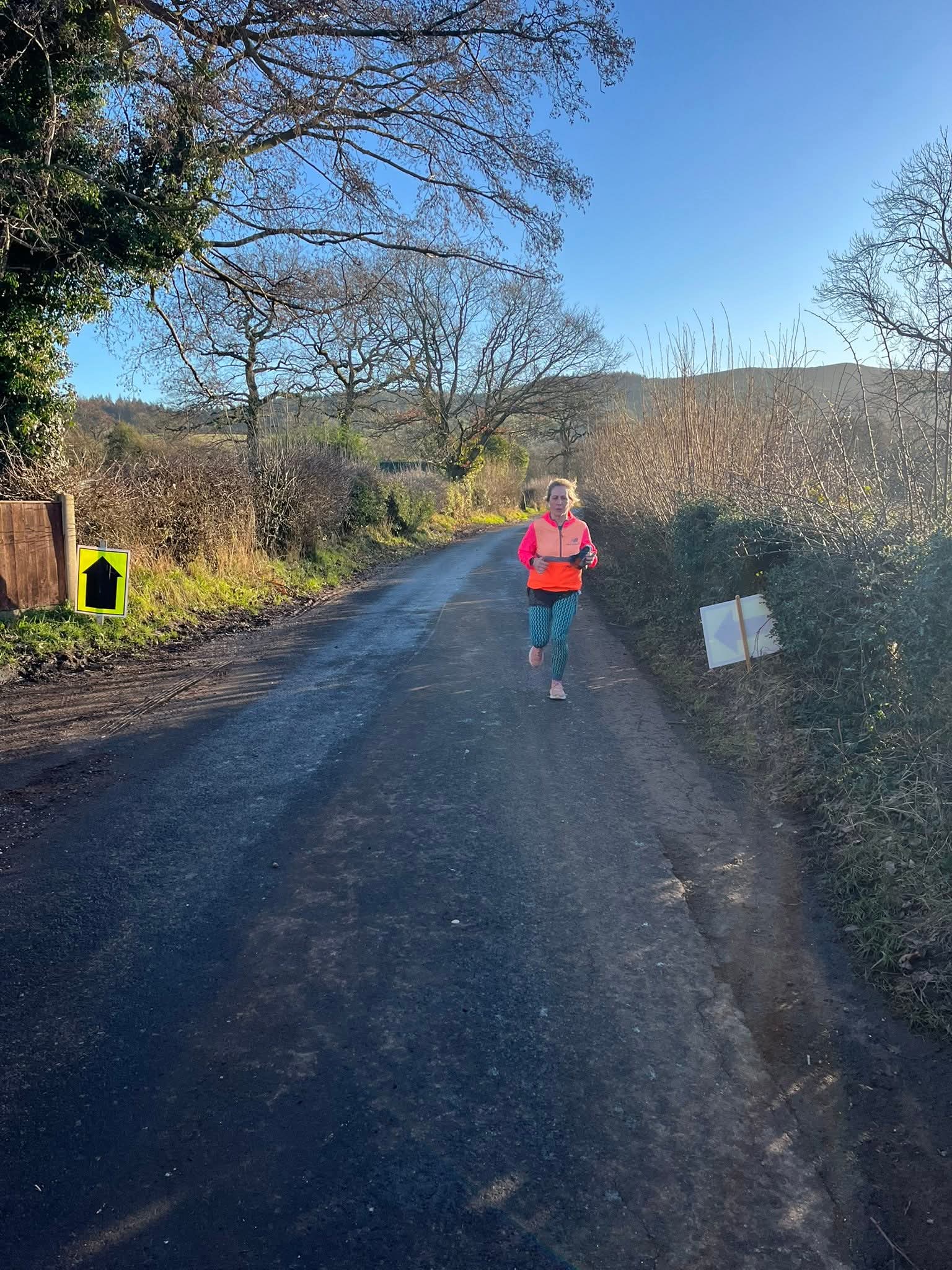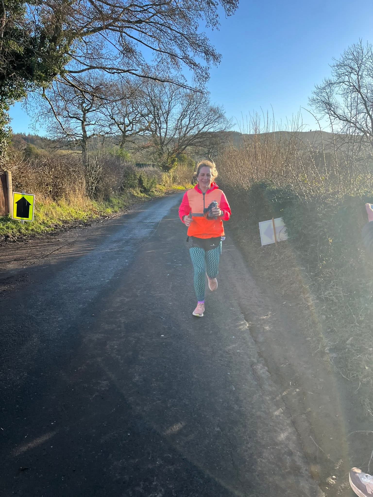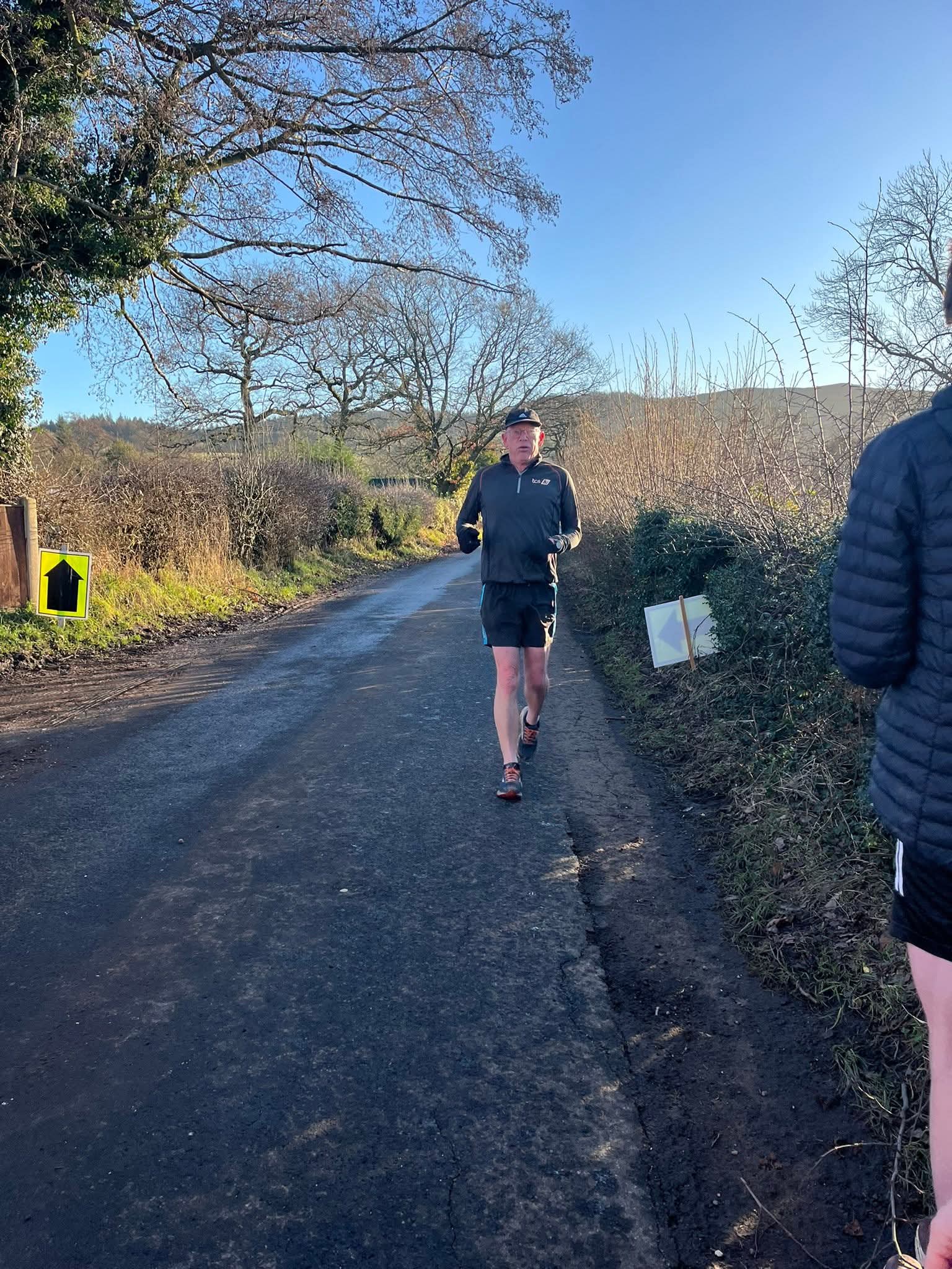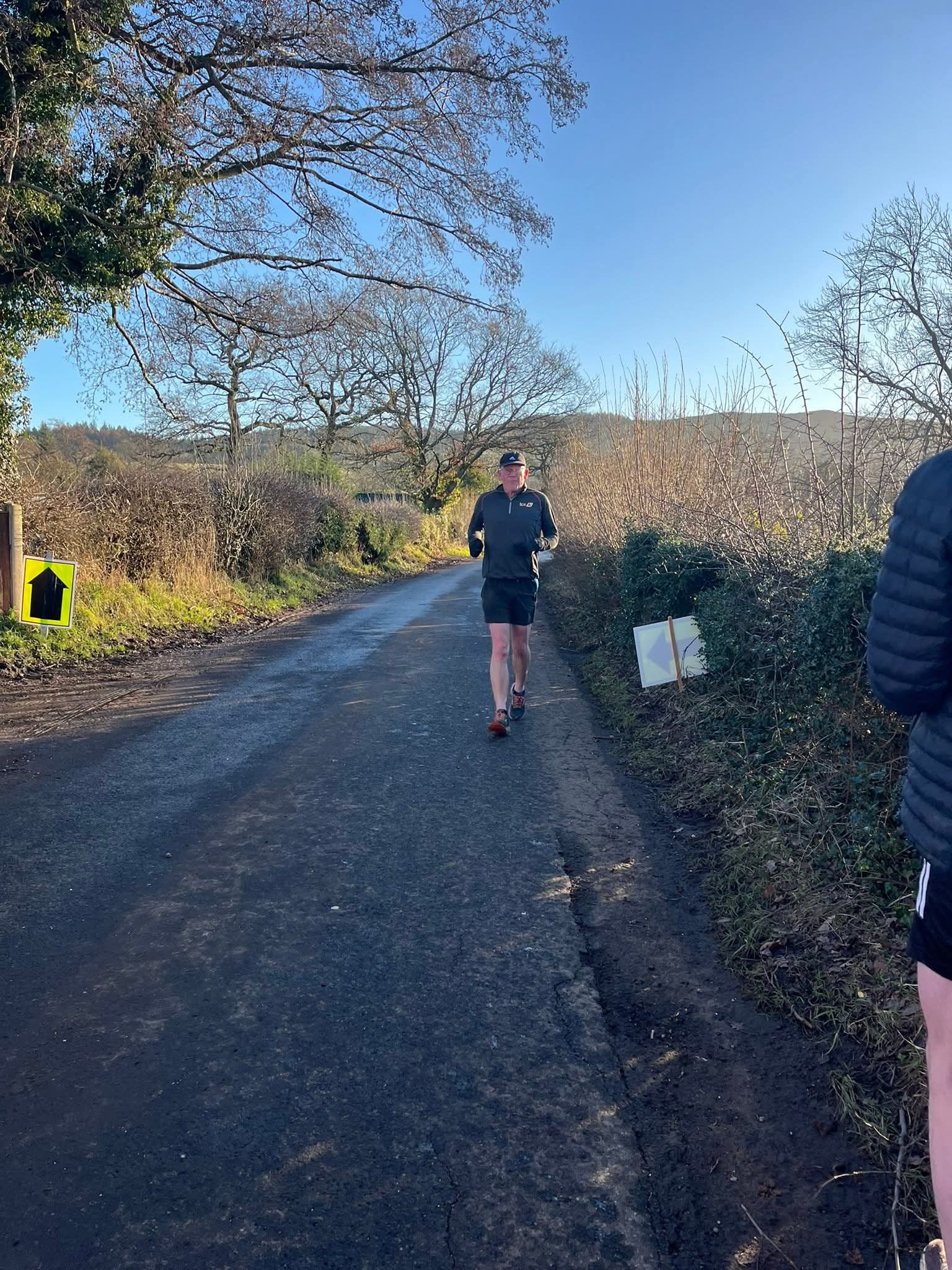 It was a lovely crisp morning with two icy areas, a small one at the turn from Whistons onto Meg lane and a larger one around a large puddle in front of Thickwithens farm. The other interesting obstacle was an open farm gate marked by a traffic cone and we added a straight on sign at the side up the road for runners. Some runners encountered a tractor.