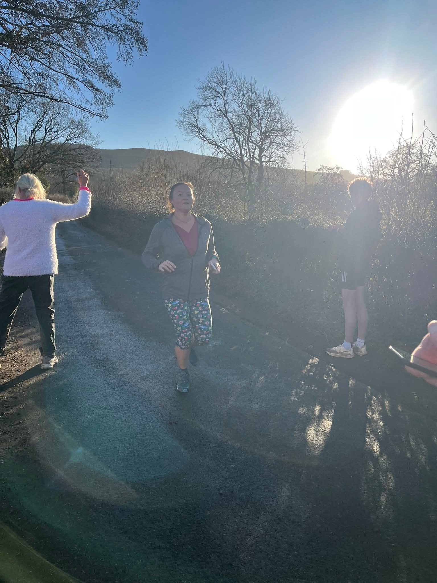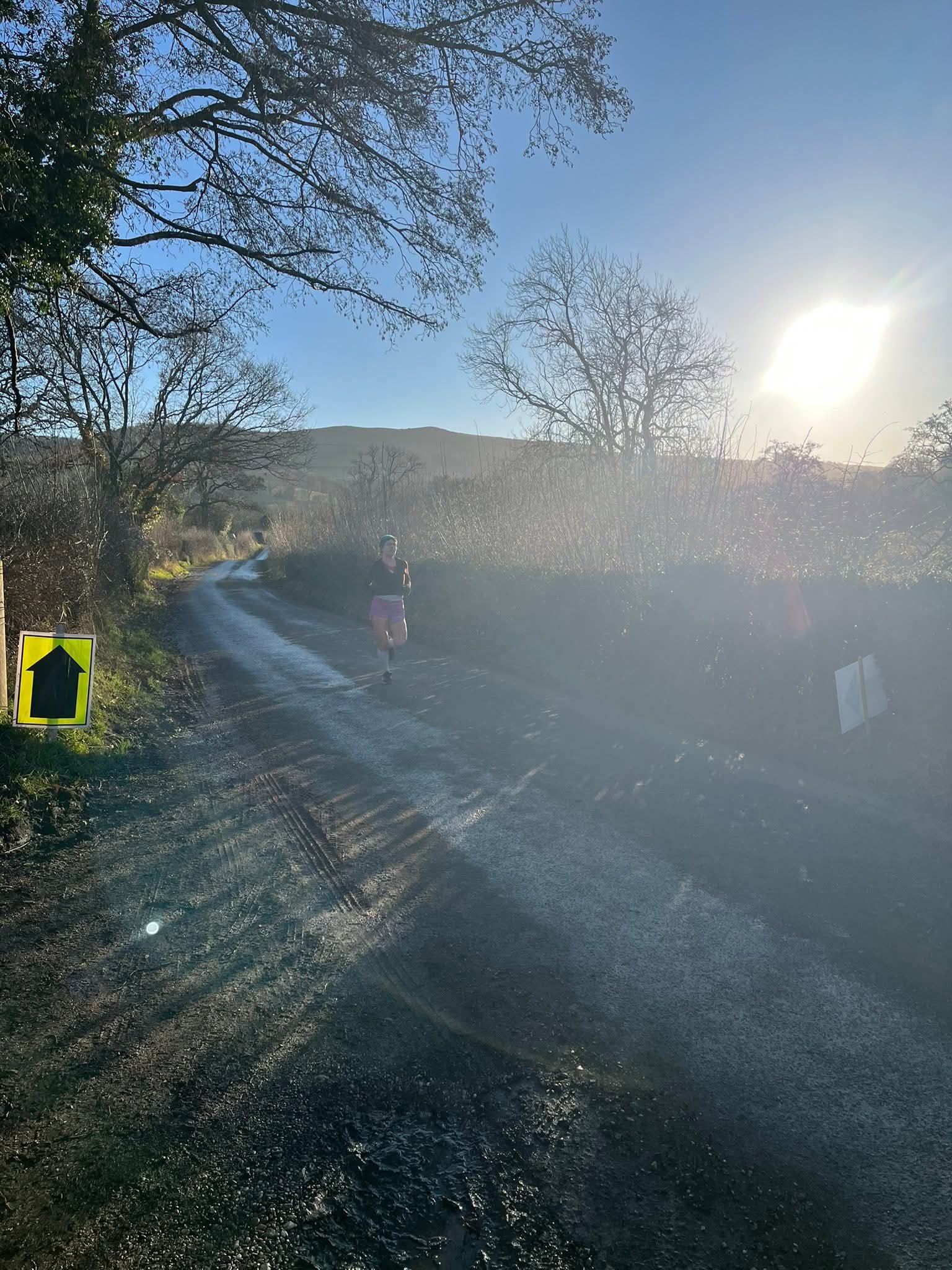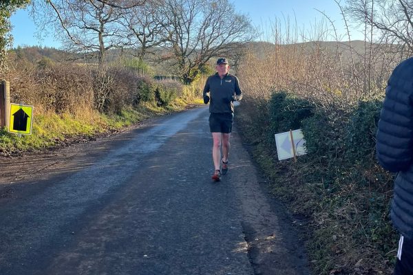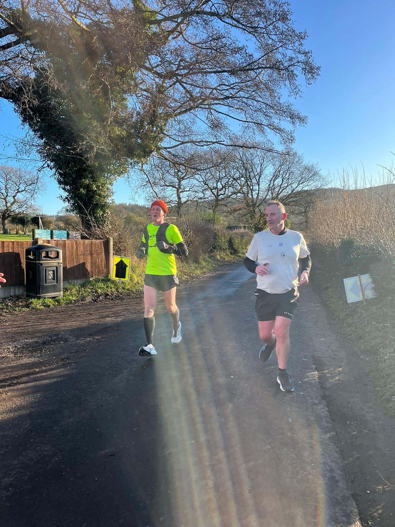 It was a lovely crisp morning with two icy areas, a small one at the turn from Whistons onto Meg lane and a larger one around a large puddle in front of Thickwithens farm. The other interesting obstacle was an open farm gate marked by a traffic cone and we added a straight on sign at the side up the road for runners. Some runners encountered a tractor.