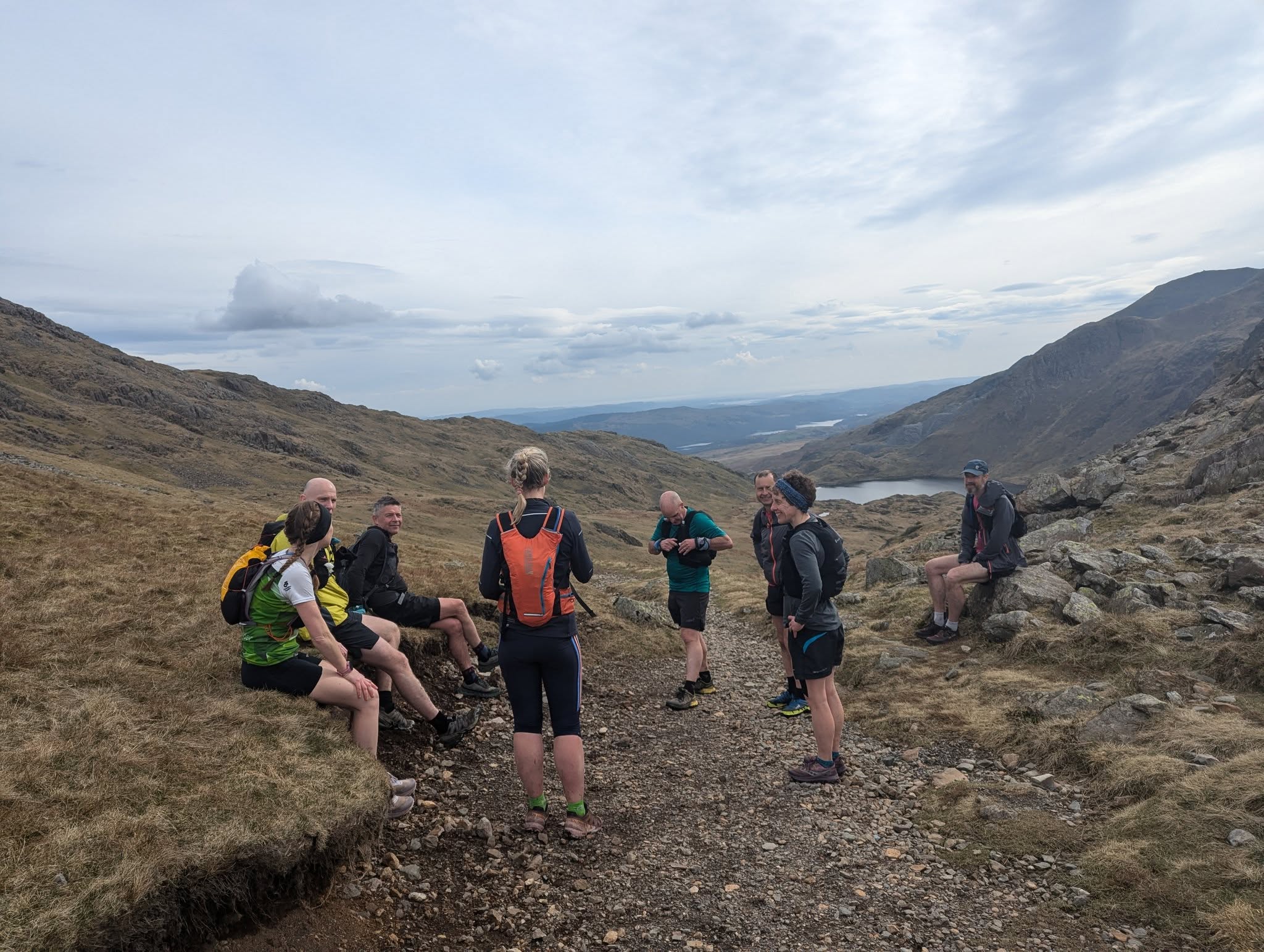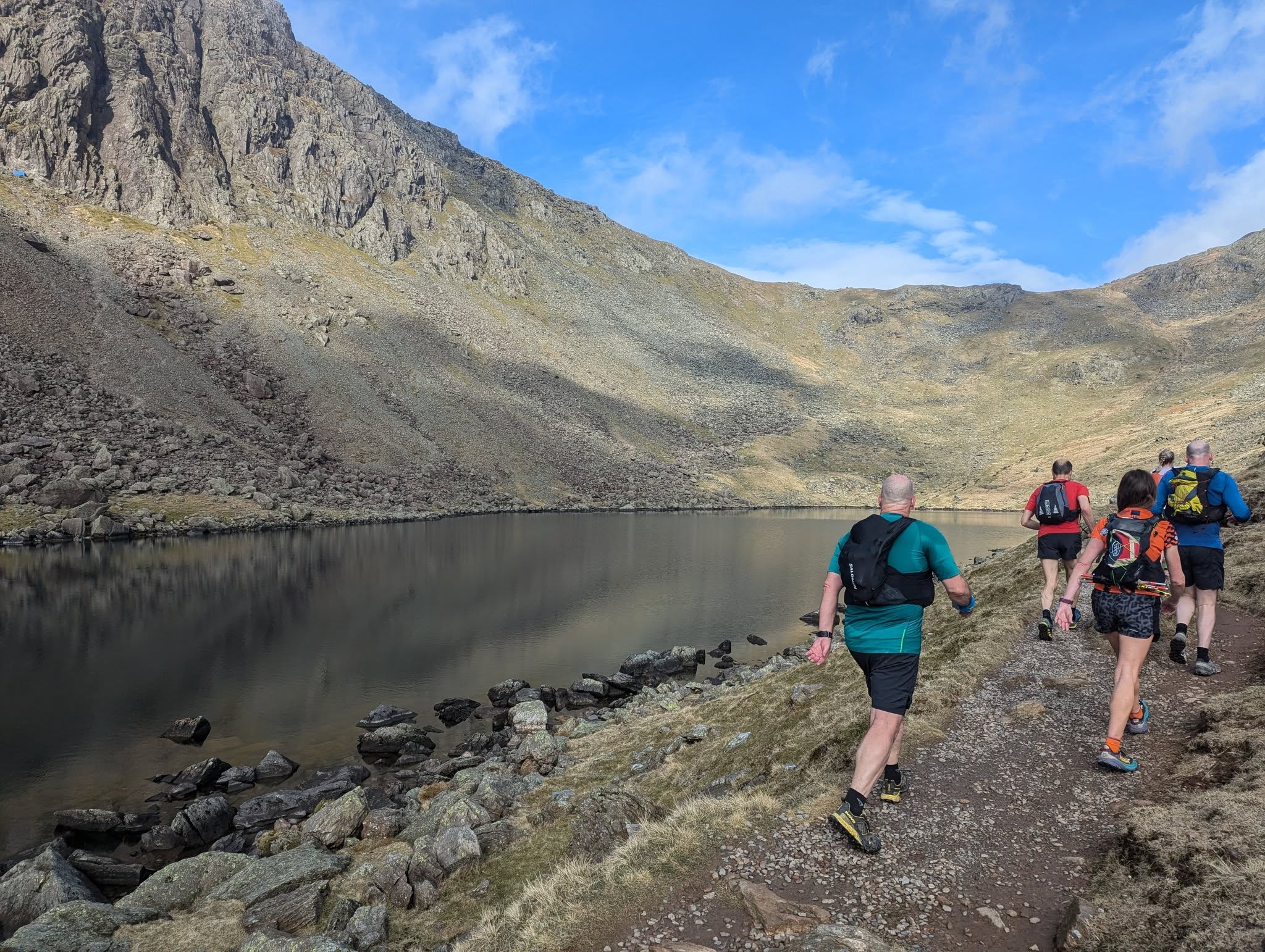 Off we went in our 2 big groups of lovely Harriers, winding past a Copper Mine and up the stony track – there was a suggestion of an extension due to the beautiful weather and the desire to see one Goat Tarn. Who could come all this way and not behold it with its bedevilled horns and hooves.