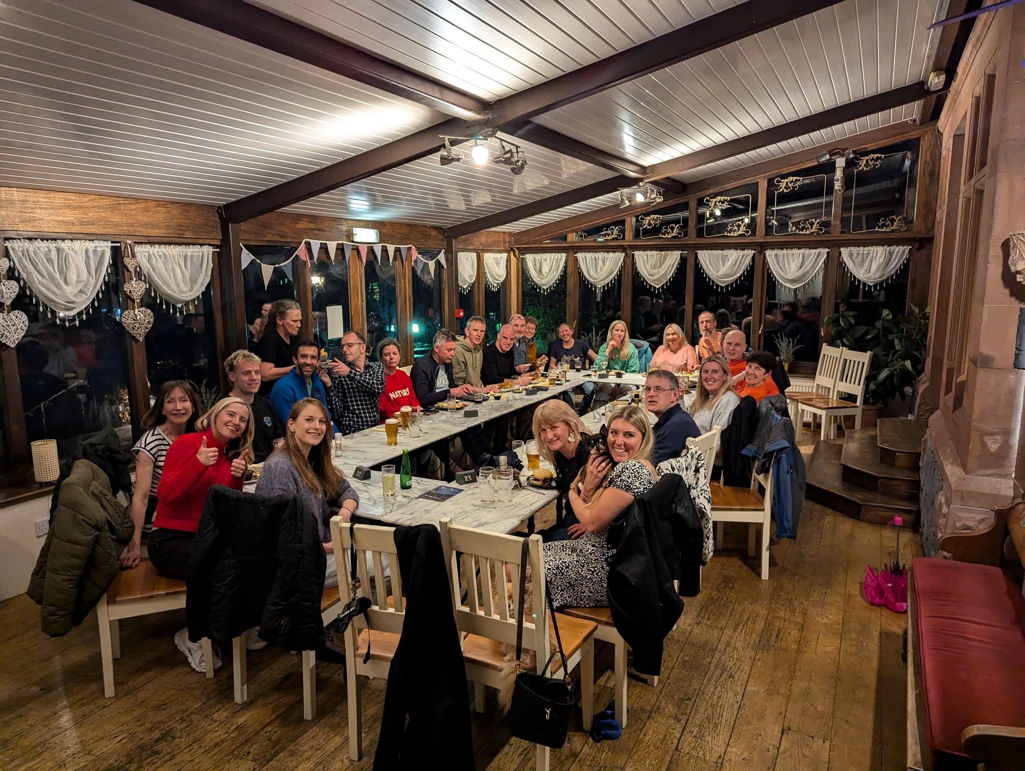 Carrying on to the meal, the pub had sat us like a grand wedding table and this suited the occasion – more recounting, sharing of pictures, moments etc – it is always lovely to look round at the happy faces of those who accompany us in life at special pursuits like these – I’m sure Tom could have done an excellent debrief,with a fine best man’s tone.