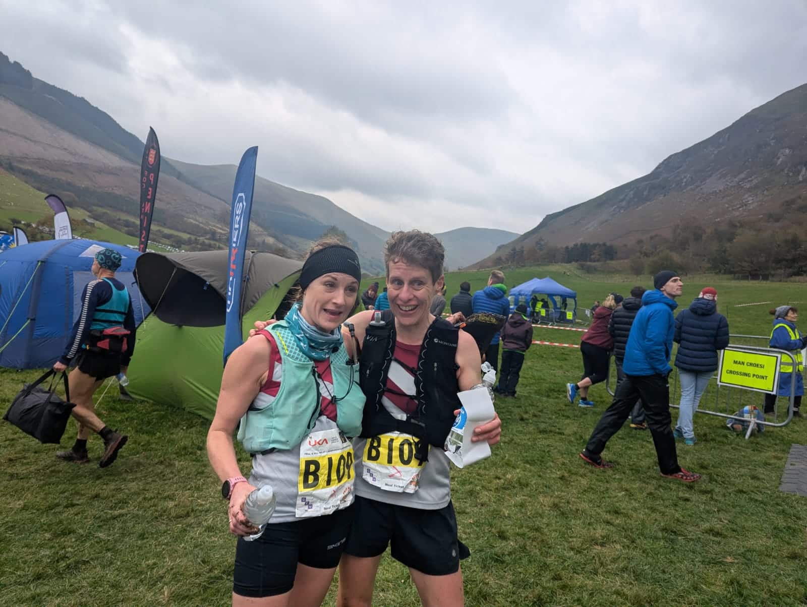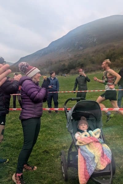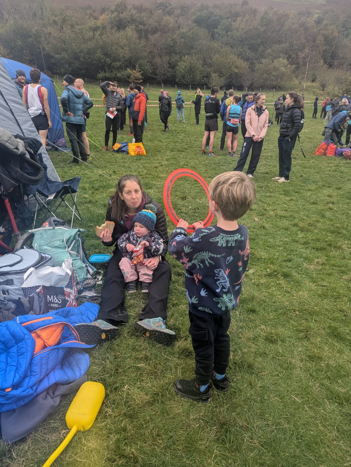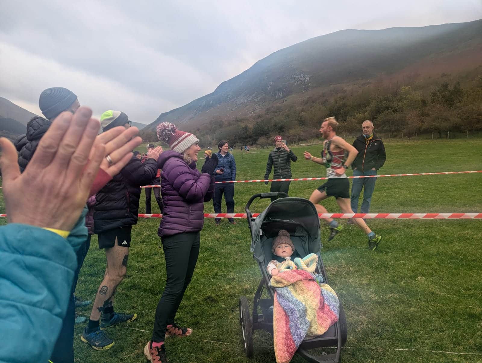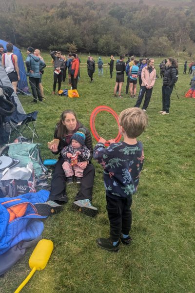 There was time for a quick perusal of the tent before our runners came in, to find the optimum spot to decant numerous packs, shoes, snacks ranging from home baked brownie to marmite crisps. Everyone found such a spot and therein made the deposit. Hannah and Billy flew past and we managed to capture a perfect mantel piece shot of Poppy cheering in the foreground – a finishing funnel is a finishing funnel wherever you are.