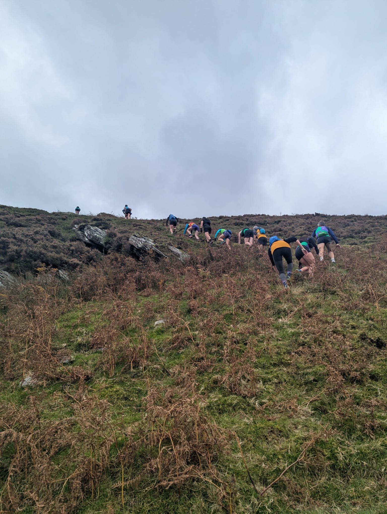 Now when people describe some mountains as steep, they usually mean it’s a slow and long walk that may take some time. What loomed ahead was not this, try not far off a vertical, rough and un-trod climb. People had mentioned before something about climbing on all fours, what on earth were they talking about……oh yes, the penny has dropped. You try not to look behind to see how others are coping with this folly, I highly recommend not doing this. For someone who has only being running 3yrs, 1.5yrs of those in fell, means I unfortunately do not have the type of engine required to deal with this relentless task, which meant that what left my mouth was few words; ‘hello’, ‘goodbye’ and ‘wtf I am doing’. 1 mile of 1400ft in elevation ensued, kill me now.