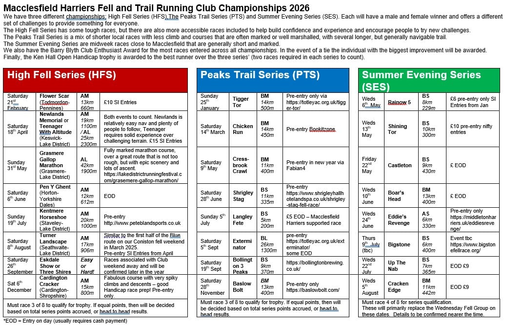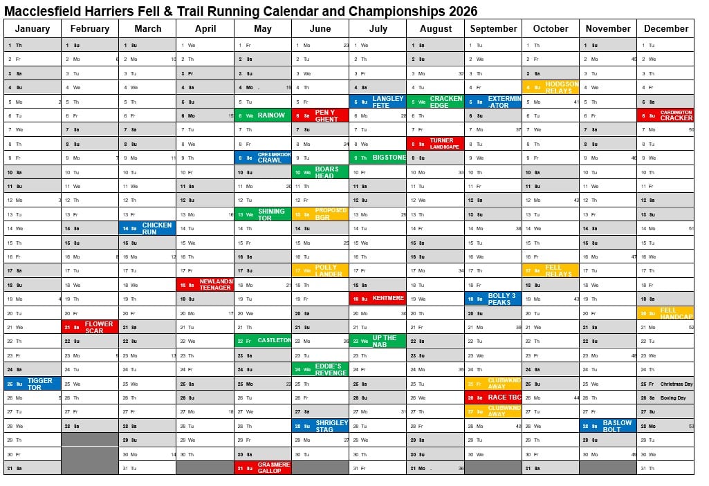 Here are the list of races for 2026 as well as other club fell running activity (see images). Some races yet to be confirmed so may need a few tweaks in due course.