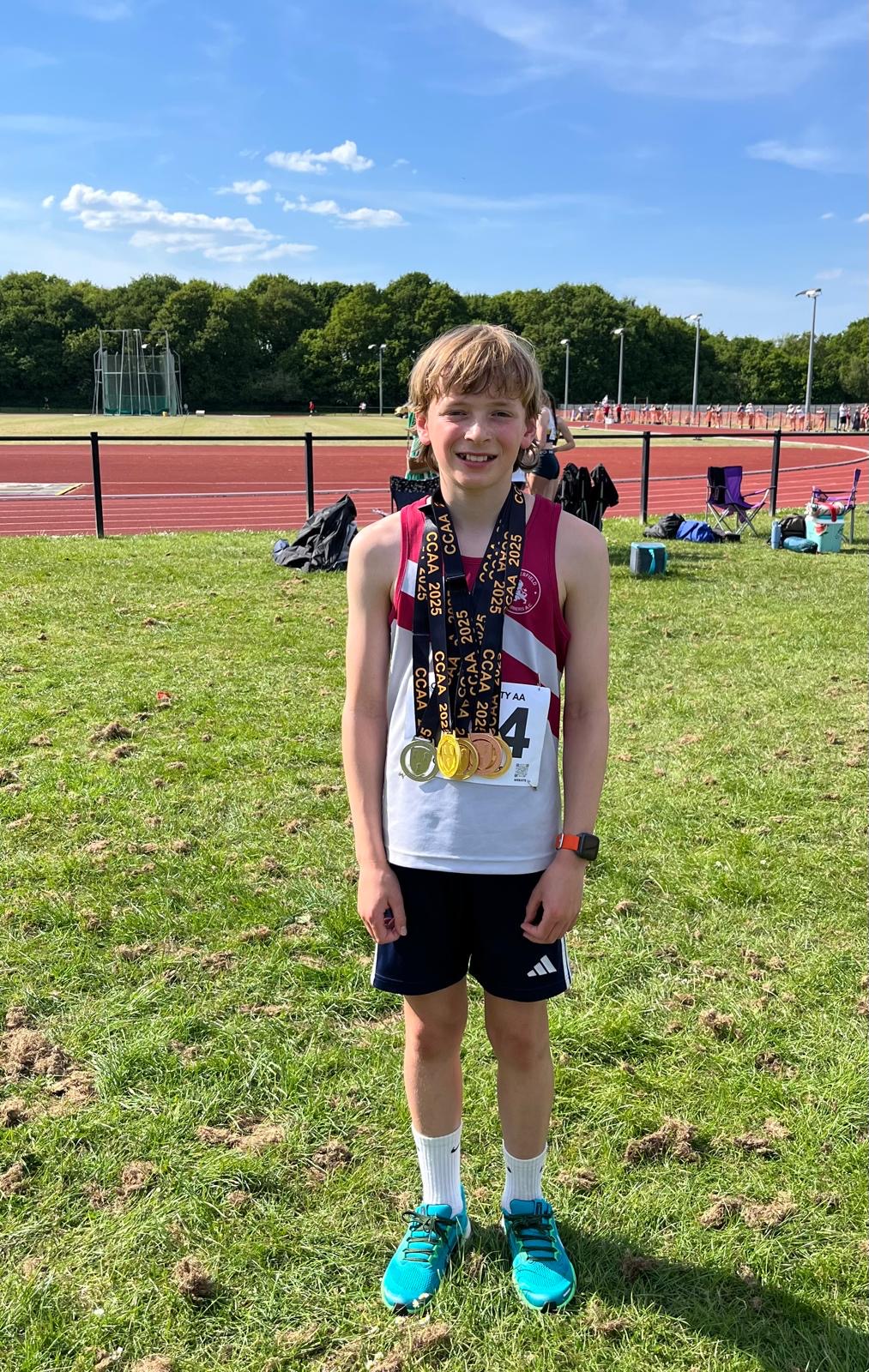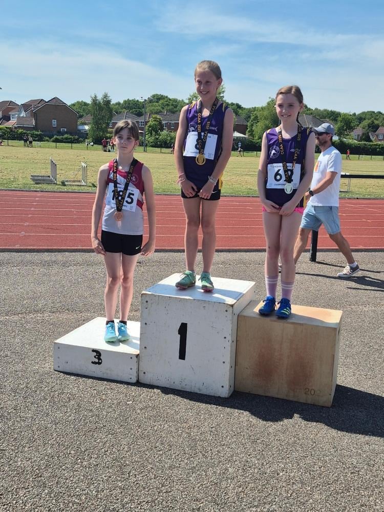 The U13 Boys won 10 medals overall, with Ben Hunsley claiming GOLD in Long Jump, High Jump and 75m Hurdles, Silver in 200m and Bronze in Discus. Gus Fisher claimed SILVER in both the 800m and 1500m with fabulous PBs in both races. George Allen won BRONZE in the Shot and came 5th in the Discus on his first time out. Ethan Beran won BRONZE in the High Jump and narrowly missed out on BRONZE in the 200m coming in just behind Ben. Archie Guest continued to show promise in his first year of competition with a BRONZE in the 75m Hurdles and PBs in the High Jump and 200m. Oscar and Lewis Furness showed typical grit in the 1500m, both achieving PBs with Oscar just missing out on breaking the illusive 5-minute barrier.