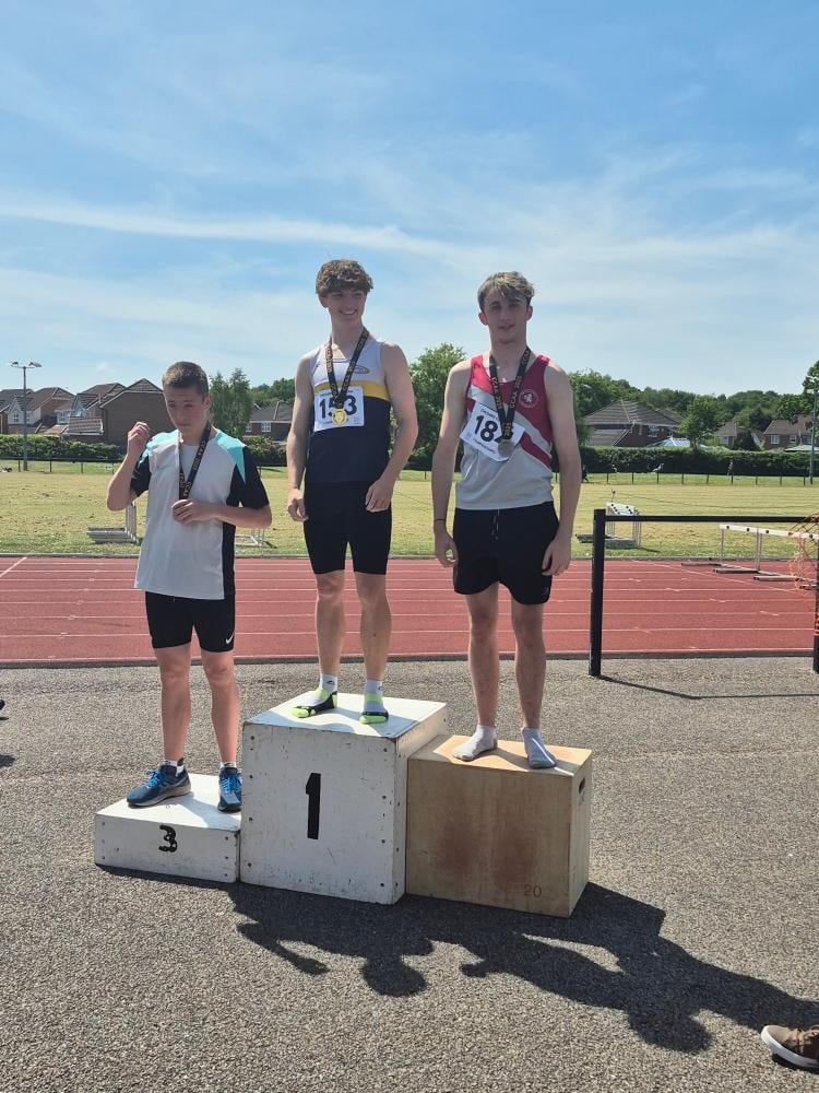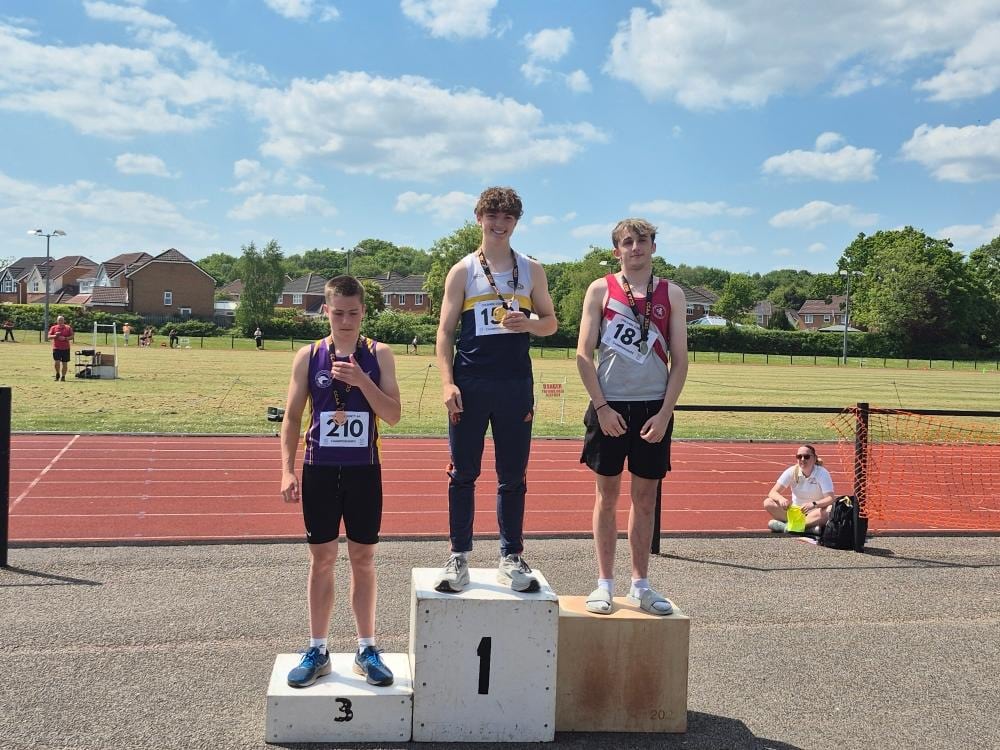The U17 Boys put in a strong team of 7 boys and claimed 8 medals. On the track, Jake Ireland won GOLD in the 1500m and 3000m, achieving PBs in both. There was more success in middle and long distance, with BRONZE medals for Jared Dickinson in the 1500m and George O’Donnell in the 3000m. Chris Melvin claimed SILVER in both the 100m and 200m, achieving PBs in both sprints. Oliver Stewart (100m) and Thomas Wood (800m) both claimed impressive PBs. In the field, Tristan Lamprecht continued his come back from injury, claiming an impressive 3 GOLD medals in the 100m Hurdles, Discus and Javelin.